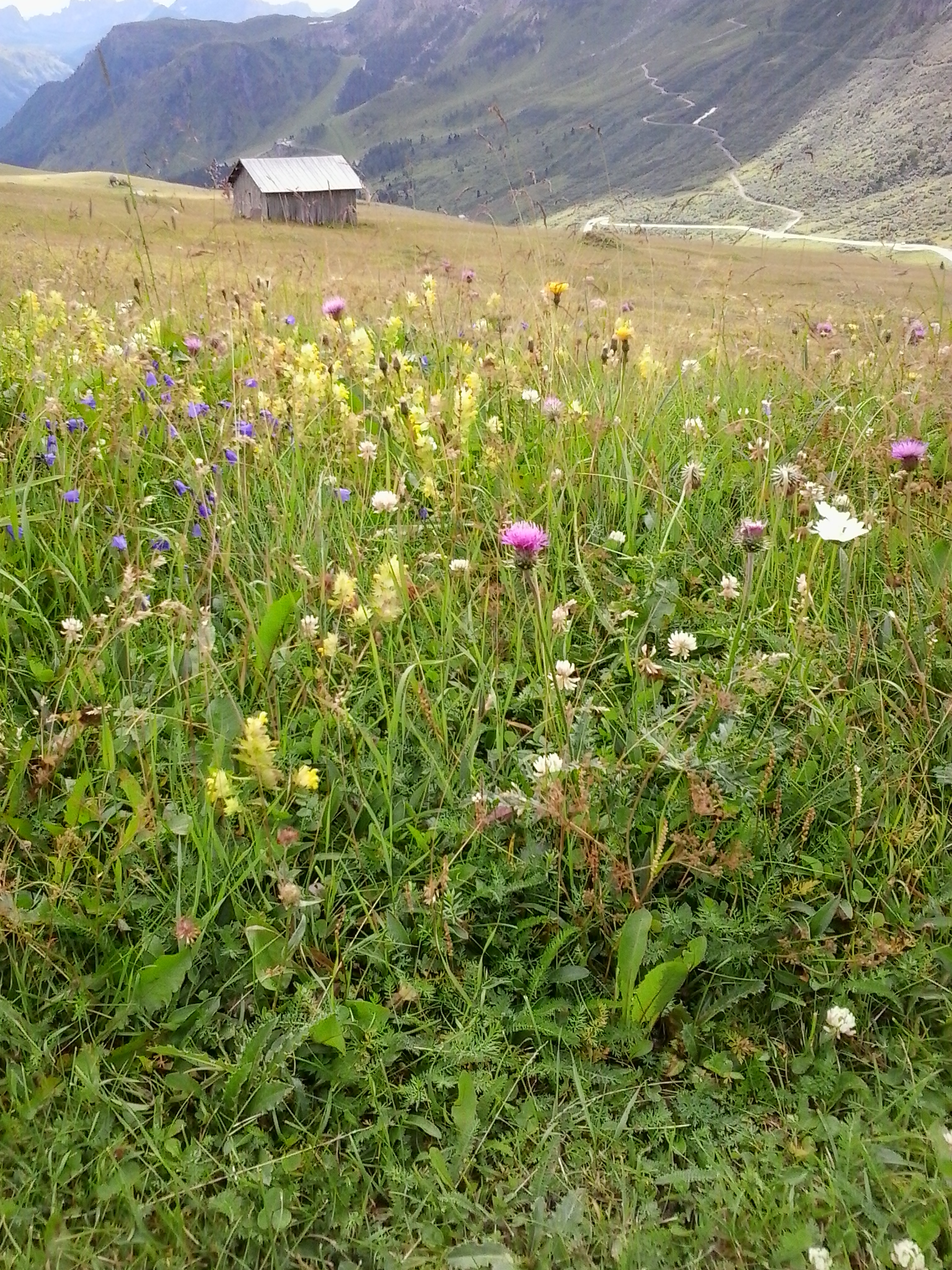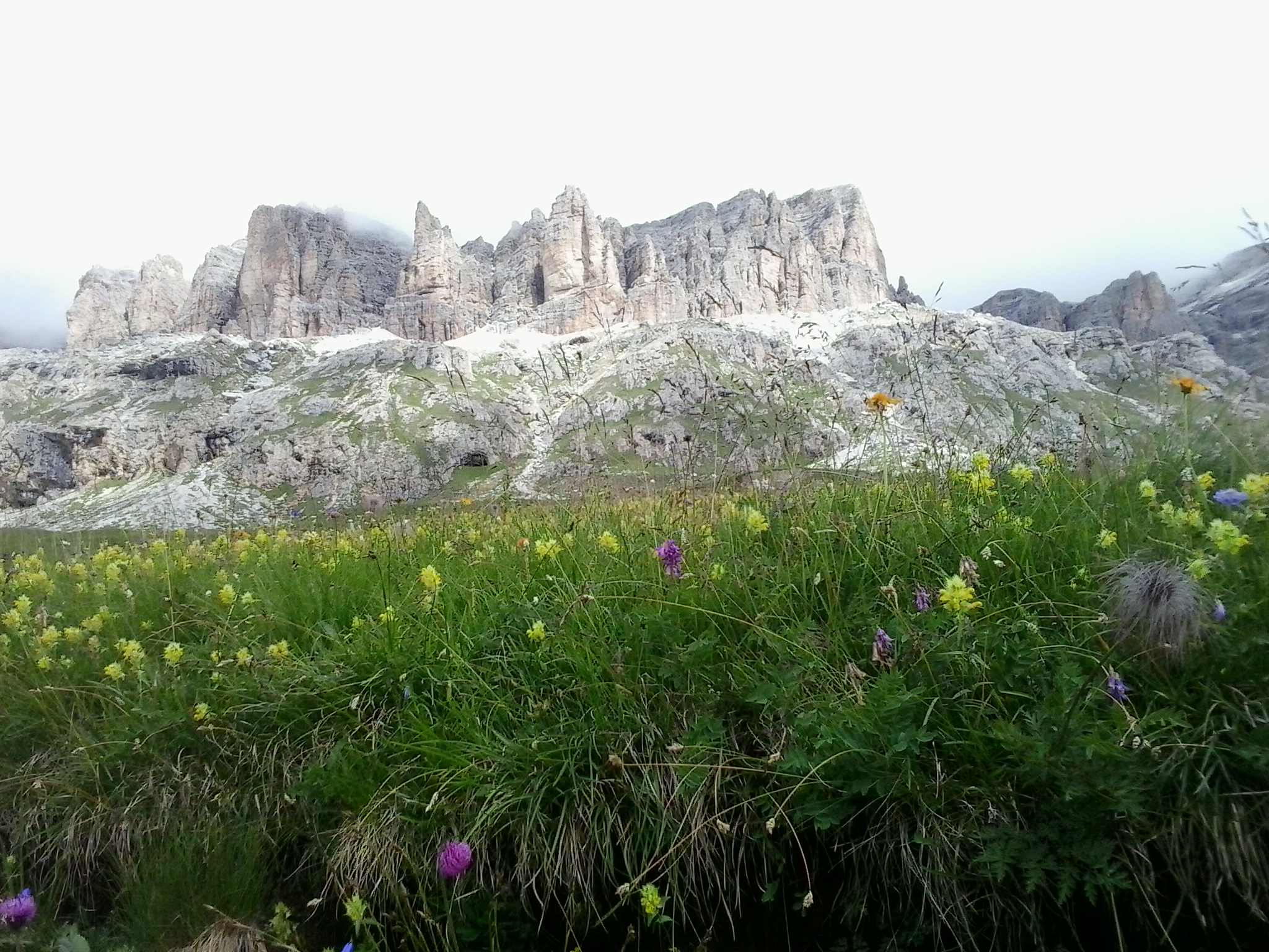 Molti usano le seggiovie o le funivie per andare in quota e godersi il sole, io preferisco sempre camminare, non amo le diavolerie come queste. Le apprezzo, ma non le amo. Non ho la smania di arrivare in vetta, di mettermi alla prova, le mie gambe fanno quello che sentono di fare e stop, quando non reggo mi fermo, mi siedo, mi guardo intorno, respiro, mi sento viva, avvisto, osservo i fiori e le piante spontanee. Guardo le cime maestose e mi sembra di essere appena un gradino sotto a D’io, che deve essere là, oltre quelle nuvole che squarciano un cielo cristallino, mollemente sbuffanti e così piene che pensi che lui da là osserva e sta comodo. Sì, D’io – se c’è – deve abitare qui e sorride paterno alle nostre ingenue fatiche di camminatori.