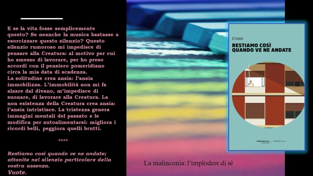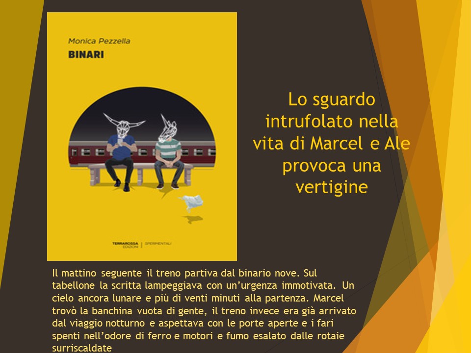 BINARI è una sfida, dovrete trovare il vostro personale equilibrio nell’affrontare questa storia, sarete in bilico e avrete timore di cadere, potreste restare a terra frastornati o rialzarvi fieri. L’autrice non è indulgente: i binari per natura scorrono paralleli e spesso seguono un eterno percorso di inabilità a divergere. Dove sta Marcel? Dove sta Ale? Scorrono insieme, ma ogni sussulto della pelle, dello sguardo, ogni impercettibile movimento e muta la direzione, la maniera di essere con se stessi e con l’altro. E’ un pozzo o la superficie piatta e ingannatrice di un lago. Ogni parola è stata vissuta da me in modo diverso dal modo in cui sarà vissuta da un altro: le visioni, le interpretazioni sono e saranno divergenti. Ognuno è un mondo a sé. Tutti abbiamo abitato una casa e molte case: la prima è quella che ci ha disegnato. La geometria degli spazi, delle stanze, delle linee che si intersecano, dei rapporti che vi scorrono, delle persone che hanno vissuto quegli spazi è ciò che ci definisce. I conflitti, le dipendenze affettive, le diversità, gli scontri aspri e gli amori travolgenti: i nonni, le madri, i padri, i figli e poi i nipoti. Le figure forti che hanno calpestato e fatto trattenere il respiro e quelle fragili che ci hanno insegnato a fermarci, ad avere dubbi e paure. Poi c’è un gatto, fuori dalla geometria di quei rapporti, non sappiamo cosa sia e se prenderlo e se qualcuno l’abbia preso, ferito, ammazzato. Due gemelli, uno malato e uno in salute, una madre e un padre diversi come pianeti paralleli, molte parentesi, perché mai saremo precisi nel ricordare, nel narrare, nel fluire dei nostri pensieri e delle nostre emozioni. C’è Francesco, che chiama le stanze con un nome, quelle stanze che ci guardano esistere inermi. Francesco che vorreste prendere tra le braccia come fareste con voi stessi, Francesco che vuole comporre la sua Creatura, la sua musica, una cosa che sia lui, e può essere una e una soltanto. Tutto avviene in una stessa casa, dove fuma hashish per dissociarsi dalla dimensione reale: il lavoro, Monica che ama e non ama, Fatima che desidera, Dario che lo abbandona alla sua vita. La Creatura è la sua scommessa, ma sono i muri delle stanze che lo osservano costruire e mandare tutto in frantumi, un attimo prima e un attimo dopo. Gli spazi sono vuoti, dentro ci viviamo noi.